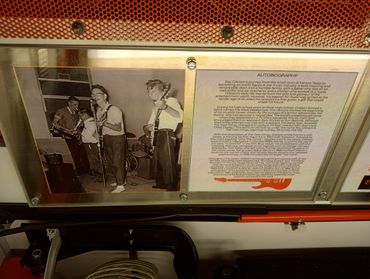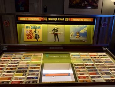 Incorporating a Roy Orbison autobiography, his albums, and a photograph of his original band performing at Wink High School, under plexiglass, adds a unique and personalized touch. The meticulous attention given to the logistics of wiring the amplifier, which enables Bluetooth connectivity, is truly commendable. The seamless integration of the record player, capable of playing both classic albums and 45s, along with the addition of custom title strips from various music genres, branded Wink High School logos and vibrant 45 sleeves,